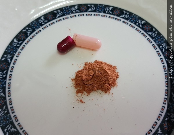 打開膠囊的粉狀是磚紅色的,直接灑在食物上即可。