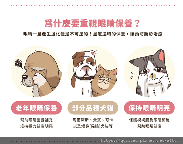 營養保健品能夠幫助毛孩透過更全面的食療保健幫助眼睛健康,幫助預防及輔助改善這些狀況的發生。汪喵原料選用上,選擇有學術臨床資料支持,來自國際大廠、純度高的食品等級原料,並以有效劑量配製,以食療的方式全方位幫助毛小孩的眼部健康。