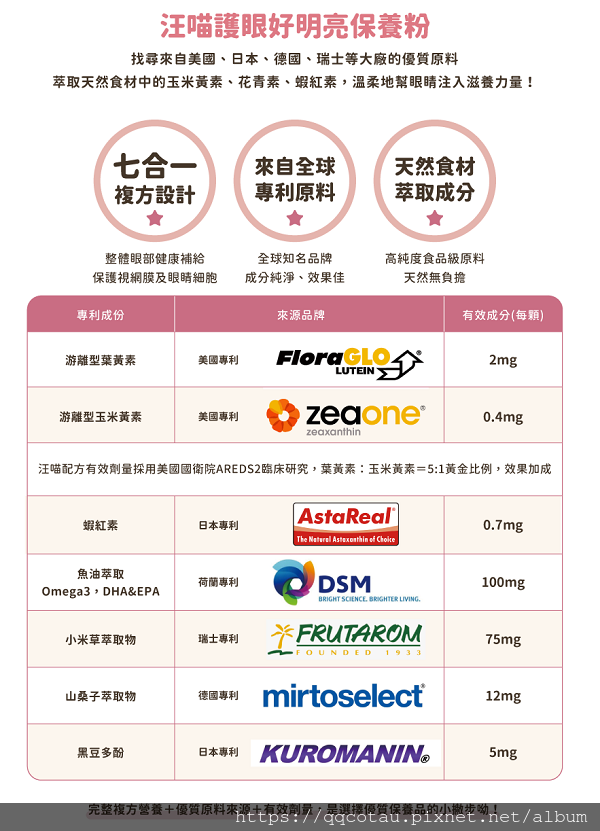 汪喵葉黃素是複方,也是進口專利原料喔!七合一複方、來自全球專利原料、天然食材萃取成分: