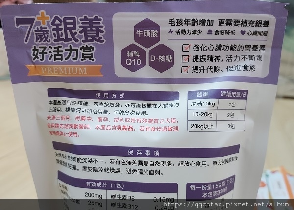 7歲+銀養好活力賞主要是針對高齡毛孩設計,但因為也有添加Q10、牛磺酸,心臟不好的毛小孩也可以考慮這款拌飯粉。