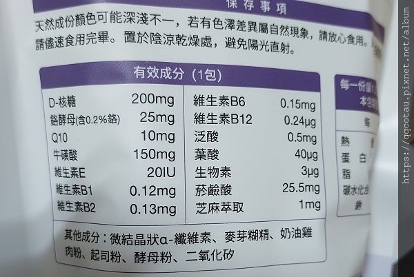 D-核糖、鉻酵母、Q10、牛磺酸、維生素E、維生素B1、維生素B2、維生素B6、維生素B12、泛酸、葉酸、生物素、菸鹼酸、芝麻萃取 |