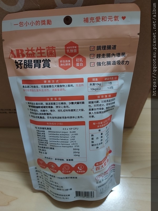 又是一包白粉,呵呵~他算是有添加少許雞肉粉增加適口性,但算是無味道的,所以也不用擔心毛孩不吃,加在飼料或鮮食裡面都很方便。