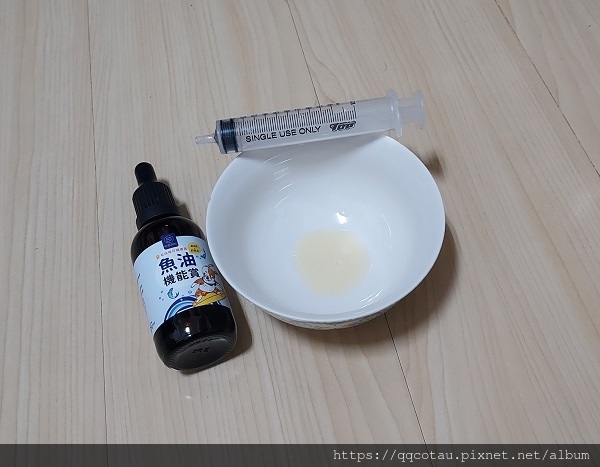 然後因為他們對魚油的接受度都比較不高,加在食物裡面通常都不吃,所以我都是用針管灌食比較快~