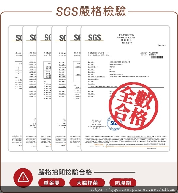 SGS 嚴格檢驗不含重金屬、大腸桿菌及防腐劑。檢驗日期:2022/2/9、2/11。(同時送檢,但因為不同項目產出報告日期不同。) |