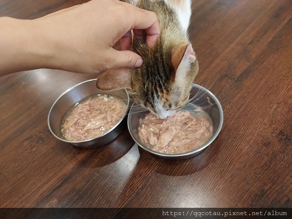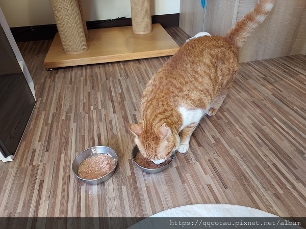 接下來就是貓咪試吃囉!迫不及待衝過來吃:好吃好吃~不用加水就很好吃!尾巴搖搖很開心!
