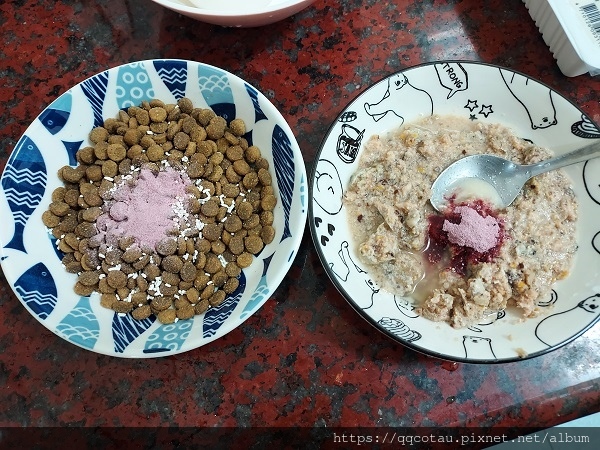 每天二餐固定加益生菌,早餐加泌尿道保健粉和魚油,晚餐加膚毛粉。